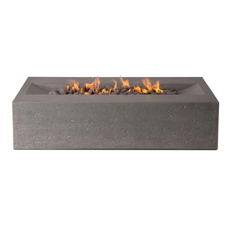 Modern rectangular outdoor fire pit with flame and decorative stones, featuring a sleek dark concrete design.
